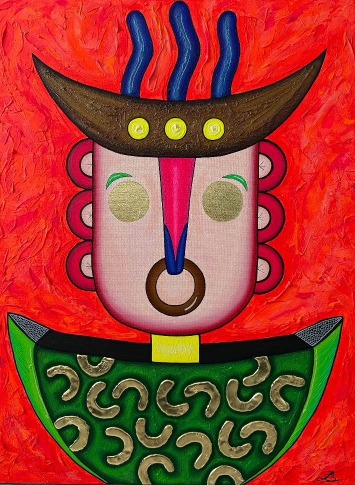 Le porteur de couleurs. On raconte que ce saltimbanque surgit toujours là où les âmes ont besoin de couleur. Ses yeux dorés et pétillants ne voient pas le monde tel qu’il est, mais tel qu’il pourrait être : plus léger, plus vif, plus libre. Autour de lui, les cotillons surgissent dans un joyeux désordre. Rubans ou croissants colorés, nul ne sait vraiment ce qu’ils sont. Ils laissent à chacun la liberté d’y voir ce qu’il veut. Car ce saltimbanque a plus d’un tour dans son sac : il n’est pas seulement un amuseur, il nous invite à retrouver la légèreté de notre âme d’enfant.