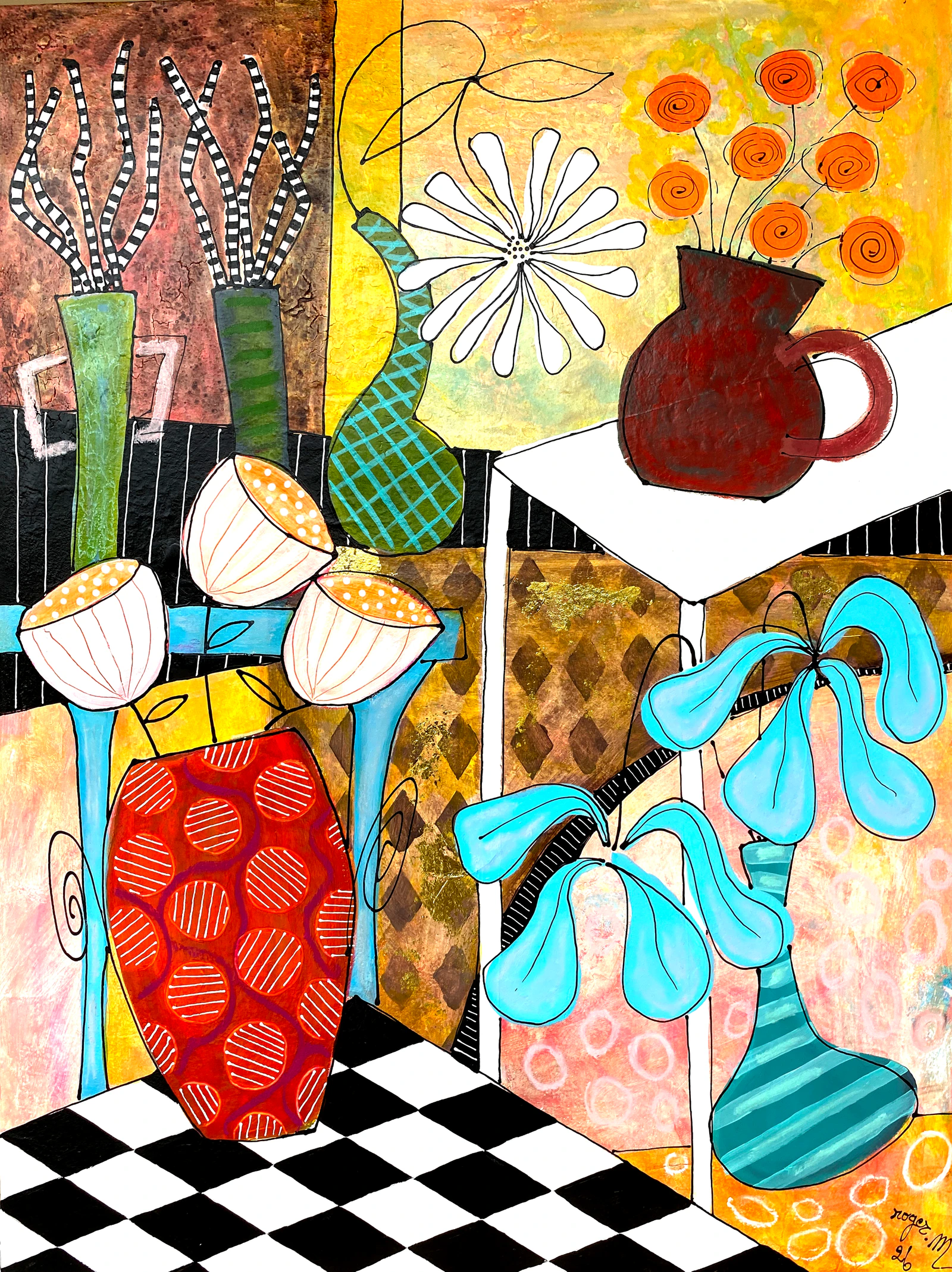 Dès le premier regard, nous sommes frappés par l'énergie vitale qui se dégage de cette composition. Roger M. nous propose ici une nature morte augmentée, où la géométrie stricte rencontre une exubérance presque enfantine, créant un équilibre visuel fascinant. Le damier noir et blanc au premier plan ancre l'œuvre et offre une base solide, presque mathématique. Ce graphisme rigoureux est repris et décliné à travers toute la toile : les rayures verticales des branches, le quadrillage turquoise du vase central et les losanges en arrière-plan. Cette répétition de motifs crée une cadence musicale qui guide l'œil de bas en haut. "Cette toile parvient à être à la fois complexe par sa construction et joyeuse par son sujet. C’est une œuvre qui ne s'épuise jamais : plus on la regarde, plus on y découvre de nouveaux détails graphiques."