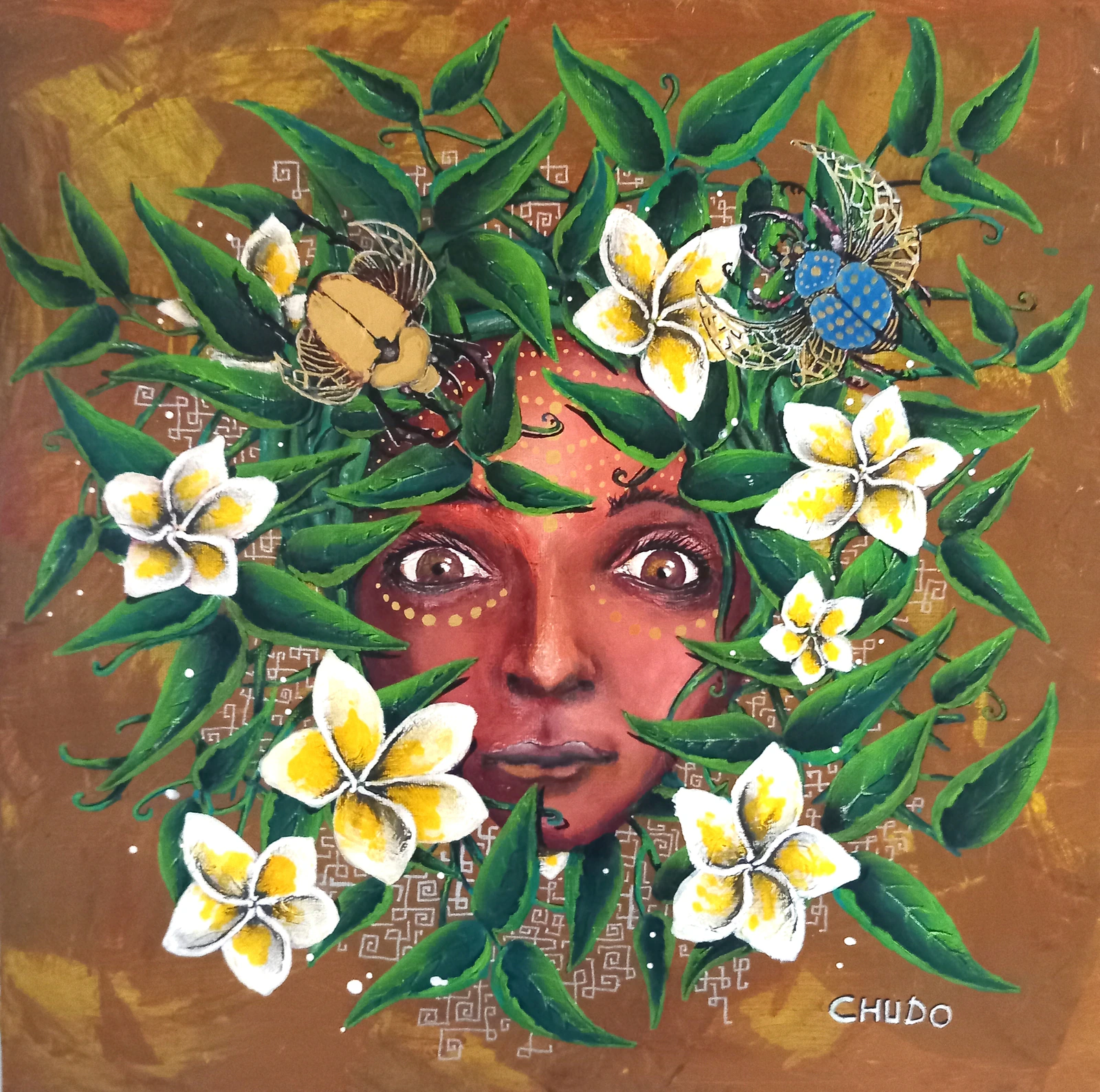 Portrait au milieu de frangipanier et de scarabées