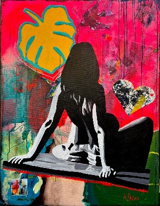 Elle est l’incarnation du désir féminin, sauvage, libre, assumé. Assise, le dos cambré, elle s’abandonne à une jouissance offerte. Son corps s’ouvre sans honte — non pas pour séduire, mais pour exister dans sa vérité la plus intime. L’homme à ses pieds, presque effacé dans le contraste, rend hommage à son plaisir. Ce n’est pas une scène de domination, mais de célébration. La toile vibre d’énergie sexuelle : le fuchsia crie la passion, le jaune éclaire la puissance du plaisir féminin, la feuille tropicale évoque la nature fertile, originelle. C’est une peinture qui parle du corps comme temple, de la sensualité comme puissance. Ici, la femme n’est pas muse. Elle est déesse. Et le désir, une offrande.