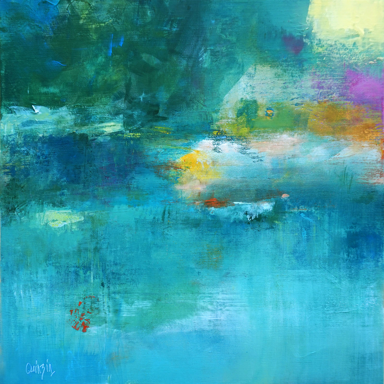 “L’été sur l’étang”, une promenade bucolique au bord de l’eau, la nature s’y dévoile sous un voile de lumière et de couleur. Les tons turquoise et émeraude évoquent les profondeurs rafraîchissantes d'un étang ensoleillé, tandis que les touches de rose et de jaune suggèrent un ciel voilé et les reflets changeants de l'eau. Paysage imaginé réalisé à la peinture l’acrylique sur toile format 50 x 50, vernis mat. Les côtés sont peints en blanc.