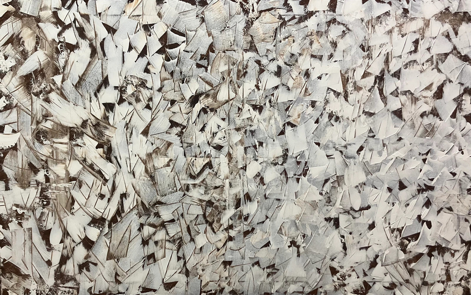 Levitas explore la matière dans ce qu’elle a de plus fragile et de plus structuré à la fois. La surface, composée d’éclats clairs et de fragments presque minéraux, semble suspendue dans un équilibre délicat. Chaque trace, chaque superposition crée un mouvement subtil, comme une dispersion maîtrisée. L’ensemble évoque une respiration visuelle. Le regard circule, se pose, puis s’élève. Il n’y a pas de lourdeur ici, malgré la densité du geste : tout paraît allégé, presque flottant, comme si la toile cherchait à se détacher du poids du monde. Cette œuvre parle d’équilibre intérieur, de cette capacité à transformer le tumulte en clarté, la complexité en simplicité apparente. Pour se sentir vivre, il faut comprendre l’importance de la légèreté…