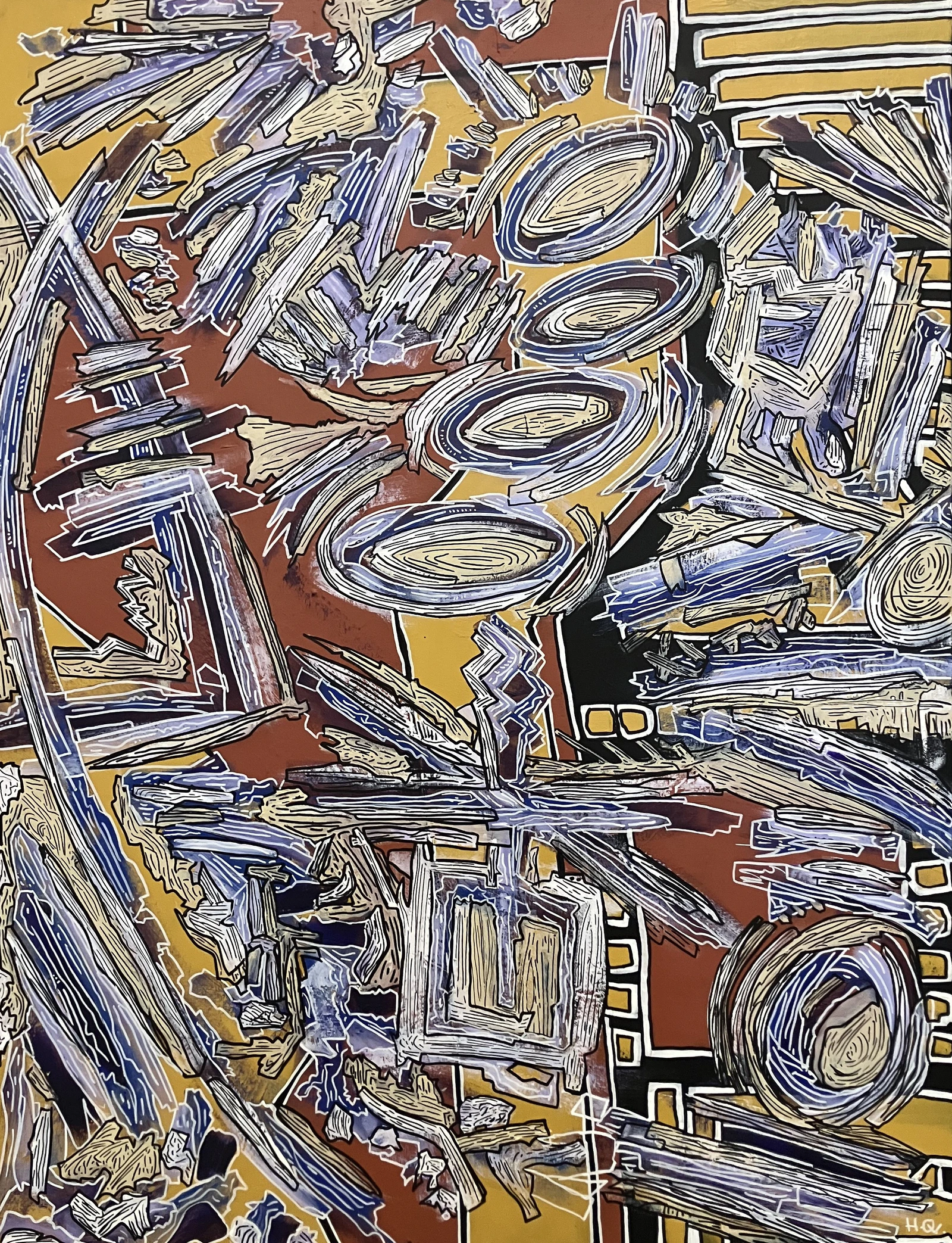 On peut décider de voir une libellule émerger en bas au centre après après une superposition de couches de peintures apposés de manière instinctives, et une mise en lumière des formes abstraites par les trames réalisées au marqueur acrylique. Le fond aux couleurs chaudes contrastes avec les bleus de la dernière couche. On se retrouve avec une œuvre graphique, aérée, ancrée et aérienne.