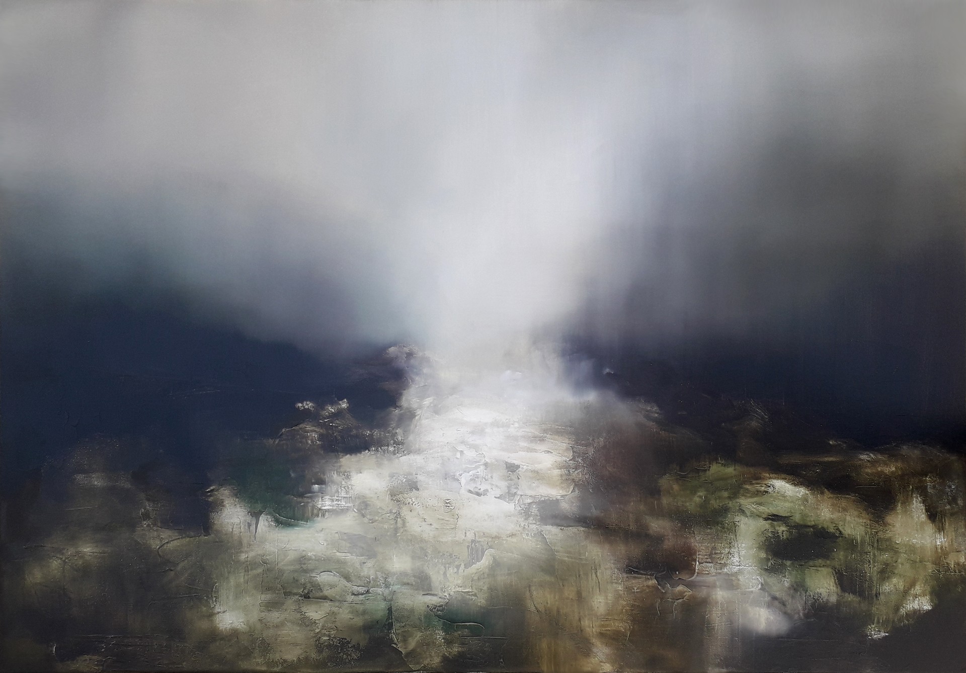 Les transitions et autres transformations font partie de mes thèmes récurrents quand il s’agit de peindre les projections de mon esprit quand je réinvente la nature. Dans cette toile très contrastée règne comme une fusion froide. Le ciel se déverse sur terre en un torrent de lumière, se frayant un chemin parmi les aspérités de la terre qu' il contribue à former. La peinture à l'huile a permis de traiter les fondus entre le ciel et les formes à l'horizon et de créer les effets de lumière sur le sol grâce à un gel de structure. Les couleurs principales, hormis le noir et le blanc, sont le sépia, le vert de Hooker et la Terre de Sienne.