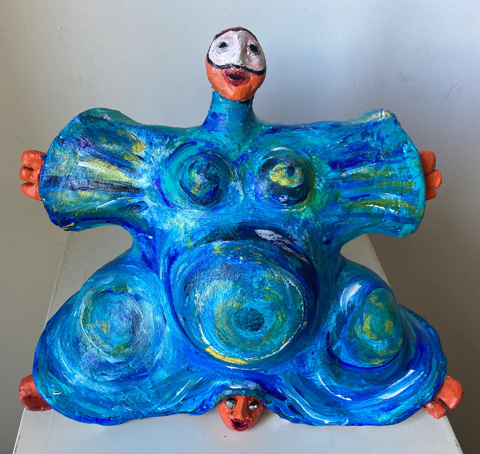 J’ai longtemps travaillé comme cinéaste. Le cinéma m’a appris le temps, la narration, le regard porté sur les corps et les figures, ainsi que la construction d’un récit invisible qui soutient l’image. Parallèlement, j’ai toujours sculpté. Certaines œuvres sont nées dans un espace silencieux, sans destination immédiate, comme on écrit des scènes sans encore savoir où elles seront montrées. Lorsque j’ai décidé de me consacrer pleinement à la sculpture, j’ai repris ces formes, non pour les corriger, mais pour les assumer. Les surfaces ont été retravaillées, les volumes affirmés, la couleur pensée comme une peau. La date que je donne à mes œuvres correspond à ce moment précis : celui où elles quittent l’atelier intérieur pour entrer dans l’espace public. Il ne s’agit pas d’un changement de médium, mais d’un déplacement du récit : du mouvement vers la présence, du cadre vers le volume, du montage vers la matière.