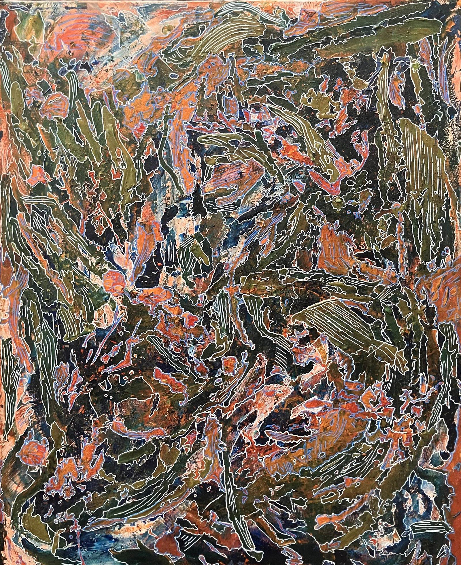 Métal est une peinture réalisé au pinceau et au couteau. Avec ses dégradés de rouge et de vert foncé et ses quelques touches de bleu cette toile plaît beaucoup. Les nuances de rouge sont faites avec des pigments provenant du maroc. Il y a ensuite un travail méditatif réalisé au fin marqueur acrylique blanc et bleu, délimitant et mettant en lumières les formes obtenues en peignant.