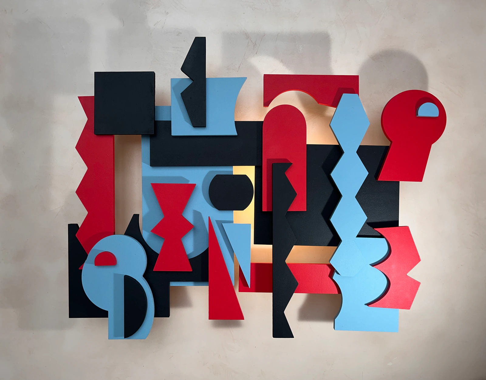 Sculpture murale en contreplaqué de peuplier 10mm peint. L72 cm x H57 cm x P5 cm Brancusi. Il était le génie de la forme et un maître de l’abstraction, dans ses sculptures mais aussi dans ses socles. J’ai maintes fois visité son atelier que j’adore, mais c’est en visitant sa dernière rétrospective que j’ai eu envie de m’approprier ses formes et d’en faire une sculpture. Brancusi utilisait les formes avec une pureté et une simplicité radicales, distillant chaque sujet à son essence géométrique, vers un état presque primitif comme un totem. Cette approche m’a profondément marqué, m’incitant à explorer comment des formes aussi épurées pouvaient évoquer une telle profondeur. En m'inspirant de son travail, j’ai cherché à capturer cette tension entre le matériel et l’immatériel, entre la pesanteur des matériaux et la légèreté de la forme. Mon œuvre est un hommage à Brancusi, une tentative de dialoguer avec son univers en réinterprétant ses formes essentielles.