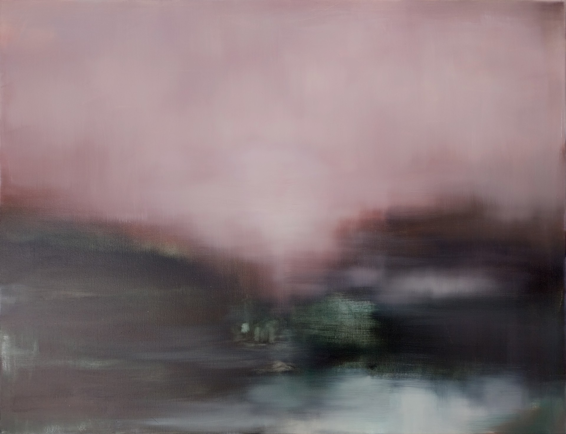 J'ai volontairement introduit dans cette œuvre une impression de flou, le paysage semble être vu à grande vitesse ou comme s'il était suspendu dans le temps et l'espace entre deux réalités de différente fréquence. Au centre j'ai placé des zones lumineuses de différentes teintes, taille et texture, elles sont sujettes à interprétation quant à leur origine naturelle ou artificielle témoignant d'une éventuelle présence humaine ou intelligente. J'aime le mystère lié à certains lieux, qu'ils soient réels ou non, cela me pousse à imaginer tout ce qu'ils ne dévoilent pas dans l'immédiateté de la perception, je pense que c'est cela qui crée la véritable ambiance d'une scène naturelle. J'ai travaillé à l'huile dans un mélange de fondus et de superpositions avec ajouts et effacements de matières selon l'effet désiré.
