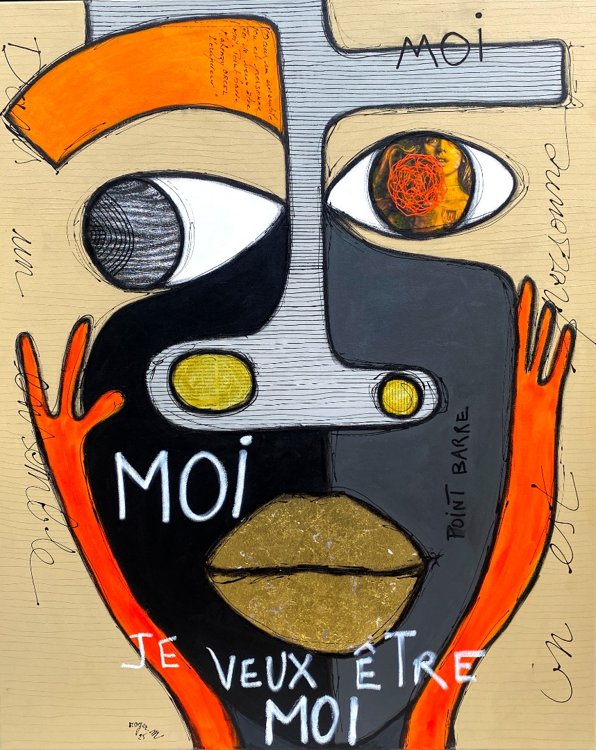 Cette œuvre captivante présente un visage stylisé, composant un message puissant sur l'identité et l'authenticité. Les couleurs vibrantes, telles que l'orange intense et le noir profond, contrastent audacieusement pour attirer l'attention. Les mots "MOI" et "JE VEUX ÊTRE MOI" sont intégrés de manière proéminente, exprimant un cri de liberté personnelle et de reconnaissance de soi. Les traits du visage, déformés et asymétriques, évoquent une quête intérieure complexe. Les yeux, l'un agrandi et l'autre rétréci, symbolisent la dualité de la perception de soi. La texture rugueuse du fond beige amplifie le sentiment de profondeur et de vérité brutale. Les lignes manuscrites en arrière-plan ajoutent une dimension intime et personnelle. Cette composition, à la fois simple et profondément expressive, incite à la réflexion sur la quête d'identité dans un monde moderne en perpétuelle évolution.