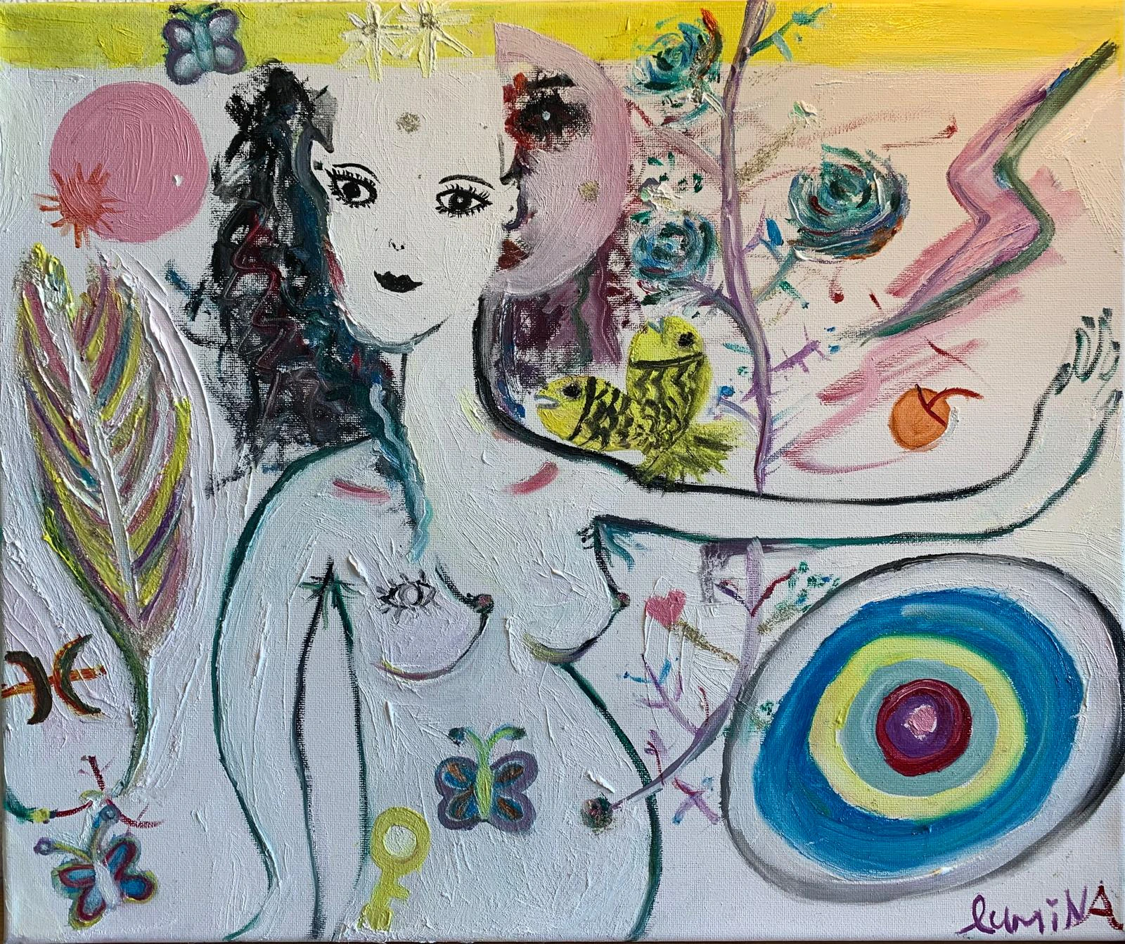 « Puisant son inspiration dans son subconscient, l’artiste raconte des histoires, des mythes, dans une esthétique naïve et enfantine contrastant avec la complexité des sujets traités. Envisageant la peinture comme une démarche psychanalytique, elle oscille entre figuration et abstraction et nous délivre une oeuvre très personnelle, à mi-chemin entre expressionnisme et symbolisme. » Lumina Wang, artiste-plasticienne et comédienne d’origine taïwanaise. Passionnée par les arts dramatiques et la mythologie, son univers singulier est retracé par des signes symboliques et une intrigue d’art dramatique. Il existe notamment une ambiguïté ludique dans ses peintures : un langage naïf voulu pour traiter des sujets complexes et psychologiques, comme les secrets familiaux, la nostalgie ou les traumatismes d’enfance, la féminité cachée ou assumée, l’interaction relationnelle, la passion et toutes les formes d’amour et de sexualité. Riche en métaphores et en sensualité, chaque peinture de Lumina Wang représente une histoire ou un mythe nouvellement créé. De manière libérée et intuitive, elle peint en suivant son inconscient et son animalité, même si, à partir d’un certain moment, elle arrive à y analyser ses choix esthétiques, comme la nature des couleurs utilisées ou les personnages représentés, jusqu’à relier tous ces éléments immergés et enfin décrire une histoire concrète.