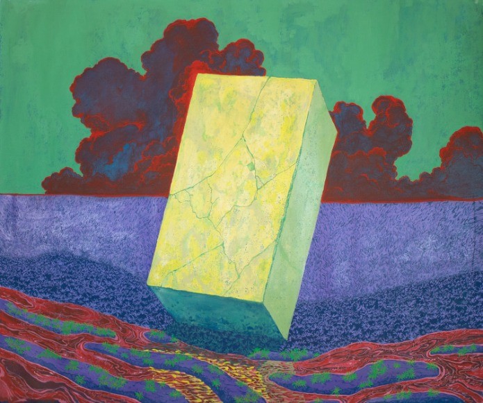 Peinture qui s'inscrit dans une série de paysages mettant en avant la ressource minérale dans un environnement inhospitalier et vif. Le monolithe est ici une pierre taillée, artificielle. Cette figure pose question sur l'utilisation de la ressource minérale ainsi qu'à sa sur-représentation dans notre environnement quotidien.