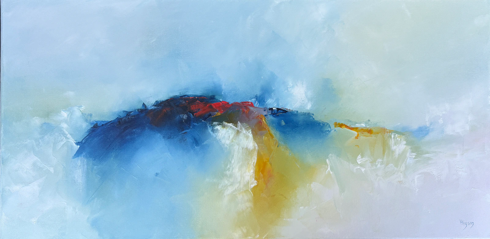 Cette œuvre abstraite captivante présente une fusion audacieuse de couleurs vives et subtiles. Dominée par un bleu profond au centre, la toile est animée par des touches de rouge et de jaune, créant un contraste saisissant. Les nuances semblent s'estomper dans un fond vaporeux de blancs et de pastels, évoquant une atmosphère onirique. Le mouvement fluide des couleurs suggère un paysage en constante évolution, invitant le spectateur à une interprétation personnelle. La texture riche et la composition équilibrée témoignent d'une maîtrise technique remarquable. Cet équilibre entre dynamisme et sérénité rend l’œuvre particulièrement mémorable.