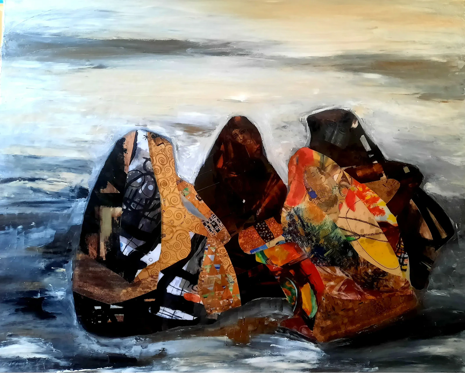Dans cette œuvre, plusieurs femmes sont réunies dans une scène de vie où elles discutent, partagent et vivent simplement un moment ensemble. Assises côte à côte, elles semblent attendre leur prochaine destination, comme une pause sur le chemin de leur existence. Leurs silhouettes sont construites par collage d’illustrations de peintres européens et indiens qui m’inspirent. Ces fragments deviennent les motifs de leurs saris et créent un dialogue entre différentes cultures picturales. À travers ces femmes présentes et visibles, je cherche à révéler la dignité, la force et la richesse du monde féminin.