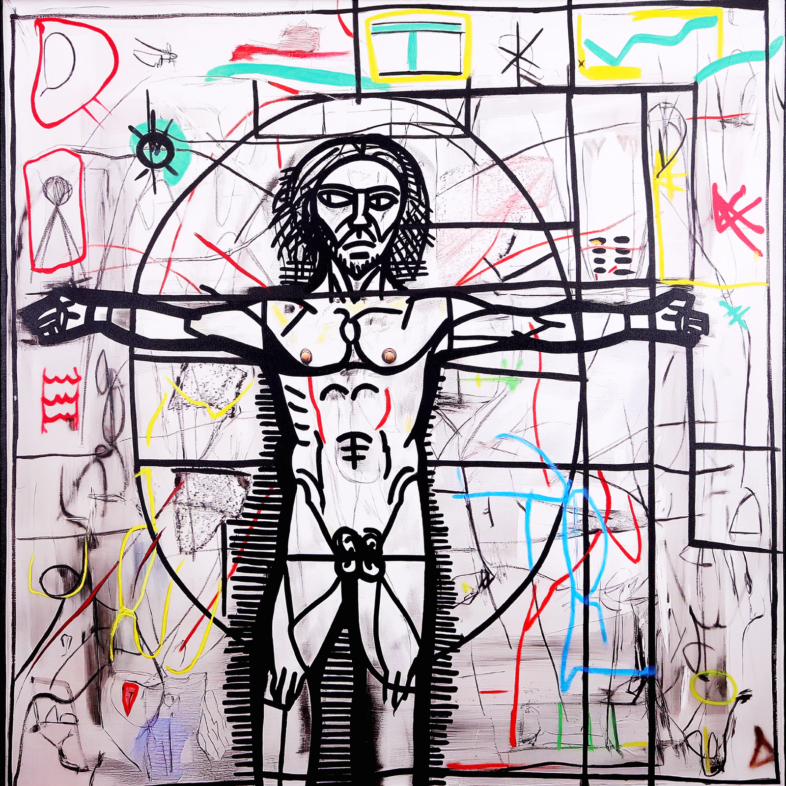 Inspiré de la célèbre œuvre "l'Homme de Vitruve" ("Vitruvian Man" en anglais), ce tableau réinterprète la vison de Léonard de Vinci des proportions idéales parfaites du corps humain masculin avec une approche néo-expressionniste où cette fois si les formes géométriques sont déstructurées et où le personnage se veux modernisé. Avec cette pièce j'ai voulu réinventer l'iconographie classique en y insufflant une énergie urbaine. Œuvre de ma série "TRIBUTE", dans laquelle je rends hommage aux grandes peintures des grands peintres. MY VITRUVIAN MAN 100 x 100 cm Peinture et marqueur acrylique, sérigraphie (fond) Année : 2025 1/1 Toile en coton montée sur châssis bois 3D Encadré avec une caisse américaine en escalier noire Signé sur le bord droit et contresigné au dos Livré avec certificat d'authenticité