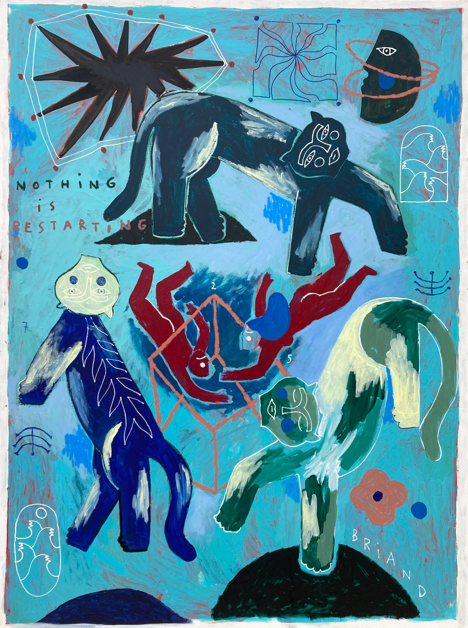 Briand ou la complexité de la simplicité. Depuis son plus jeune âge, Brian ne lève pas son crayon du papier, créant toutes sortes de dessins abstraits. Lorsqu’il découvre le graffiti vers l’âge de 13 ans lors d’un voyage à Paris, il est immédiatement attiré par cet univers secret, interdit et enivrant. Diplômé des Arts Appliqués, fasciné par les Premiers Arts, l’Art Primitif, les Aztèques ainsi que les bas-reliefs religieux européens, il affine ses lignes, clarifie son style et utilise tour à tour crayons, Poscas, peinture ou bombe aérosol pour créer des univers aussi purs que phantasmagoriques, où les animaux et la nature prédominent souvent. Né au pied des volcans, il ressent un besoin vital de se confronter constamment à des éléments naturels puissants, tels que les montagnes ou l’océan, qui l’apaisent et l’impressionnent de manière unique. À 37 ans, Brian est un artiste hypersensible, intuitif, spontané et sincère, dont le style graphique naïf et précis lui permet d’exprimer ses émotions, ses tourments et ses rêves avec poésie et douceur. Son art lui permet également d’affronter le monde et ses réalités, d’aborder les questions existentielles de la vie, de la mort, des liens et de l’intuition, afin de trouver progressivement sa propre place dans cette humanité complexe