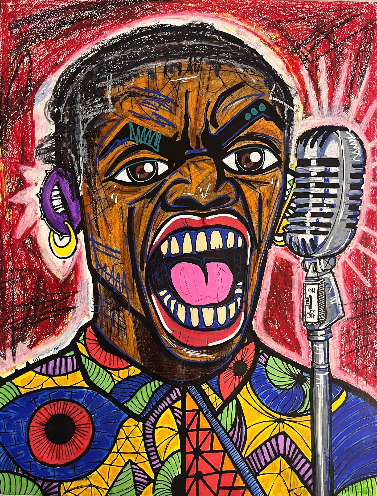 Avec On / Off, je capture l’instant où la voix devient arme, cri et délivrance. La figure centrale, bouche grande ouverte, semble pousser un hurlement qui dépasse le simple cadre sonore : c’est un appel, une révolte, une affirmation d’existence. Face au micro rétro, l’expression déformée, les dents serrées et les yeux tendus témoignent de la tension entre la nécessité de parler et la violence souvent liée au fait d’être entendu. Le fond rouge, griffé et incandescent, amplifie cette charge émotionnelle, évoquant la scène comme champ de bataille ou espace brûlant où la parole se risque. Le vêtement aux motifs africains, vibrant de couleurs géométriques, inscrit le personnage dans une continuité culturelle et symbolique : chanter, crier, raconter, c’est aussi porter l’héritage des voix qui ont précédé. Le micro, marqué d’un interrupteur “ON / OFF”, devient un symbole ambivalent : outil d’expression autant que dispositif de contrôle. Qui décide quand la parole est activée ou coupée ? Ce détail nourrit une réflexion sur la visibilité, la censure et le poids de la voix noire dans l’espace public. Par son style nerveux, ses contours brutaux et sa palette éclatante, On / Off transforme le cri en image monumentale. L’œuvre rappelle que la voix n’est jamais neutre : elle naît d’un feu intérieur, elle perturbe, elle libère et elle dérange.