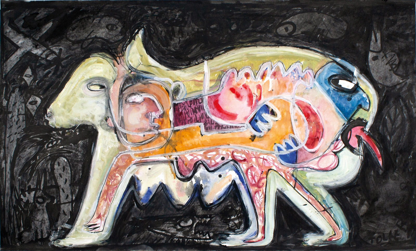 Technique mixtes sur papier : encre, aquarelle, fusin, craies sèches. Papier sur panneau MDF encadré bois naturel