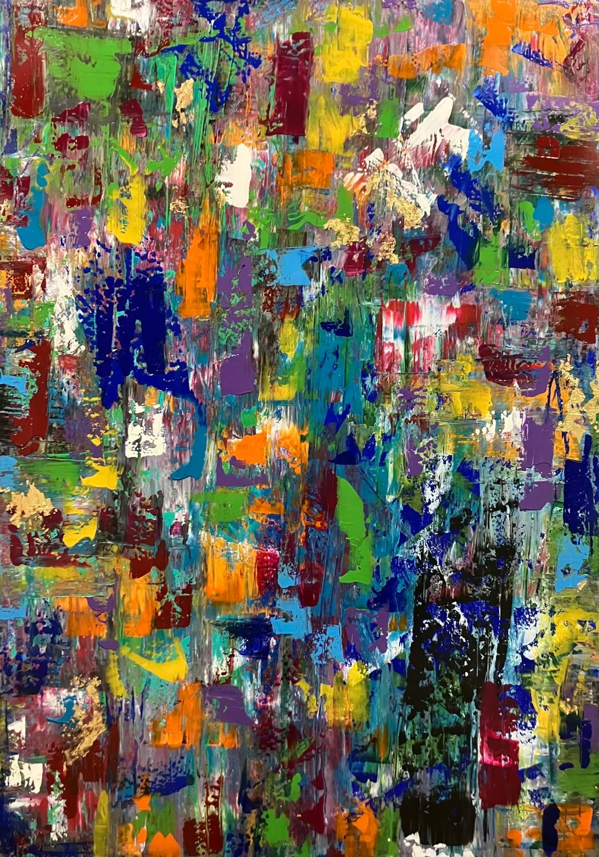 Partitura Vitae — la partition de la vie Partitura Vitae affirme que la vie ne se fige jamais : elle s’écrit à chaque instant. Avant l’explication, le mouvement. Avant la mémoire, la trace. Les couleurs surgissent comme des notes, se croisent, se superposent et se transforment. Le jaune éclaire, le bleu traverse, le rouge pulse, le vert respire. Chaque geste inscrit un moment, chaque matière garde la mémoire d’un passage. Peindre devient une écriture vivante. La composition se déploie comme une partition ouverte : rien n’est effacé, tout se transforme. Les fragments s’assemblent et prolongent la phrase infinie de l’existence. Le geste devient écriture. La couleur devient mémoire. La peinture devient transformation. Nos vies se dessinent à chaque instant, comme une partition ponctuée de toutes choses, jusqu’à l’osmose…