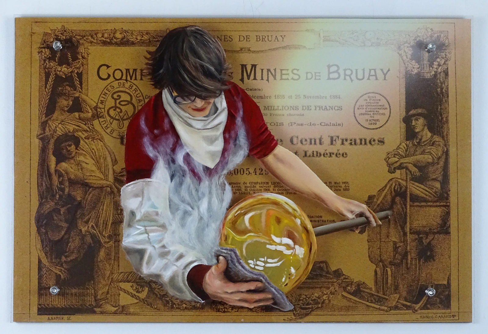 Au premier plan, une peinture à l'huile sur plexiglas représentant une souffleuse de verre, à l'arrière-plan une photo d'une action d'une mine de charbon marouflée sur bois.