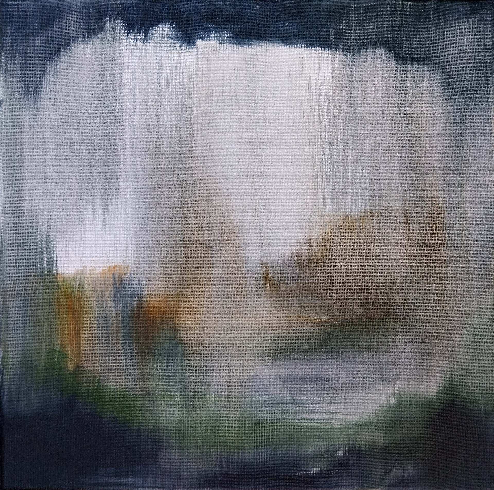 Pesanteur 7 s'apparente visuellement aux toutes premières photographies existantes, avec une lumière voilée par une texture diaphane, donnant l’impression que le paysage naturel en devient surnaturel. J’ai utilisé tout un jeu de dilutions pour parvenir à créer cette ambiance éthérée, proche des estampes japonaises et de leurs montagnes brumeuses. La lumière a été rendue par le fond blanc de la toile sans ajout de matière pour éviter toute lourdeur dans la facture. Ainsi, les différentes zones de la toile ont été reliées entre elles par une série de coups de pinceau exclusivement verticaux, rendant compte dans une sorte d’estompe globale de la relation directe existant entre le ciel et la terre. Il apparaît une tension dans la lumière qui est attirée a la fois par la gravité de la terre et par celle de la voûte céleste.