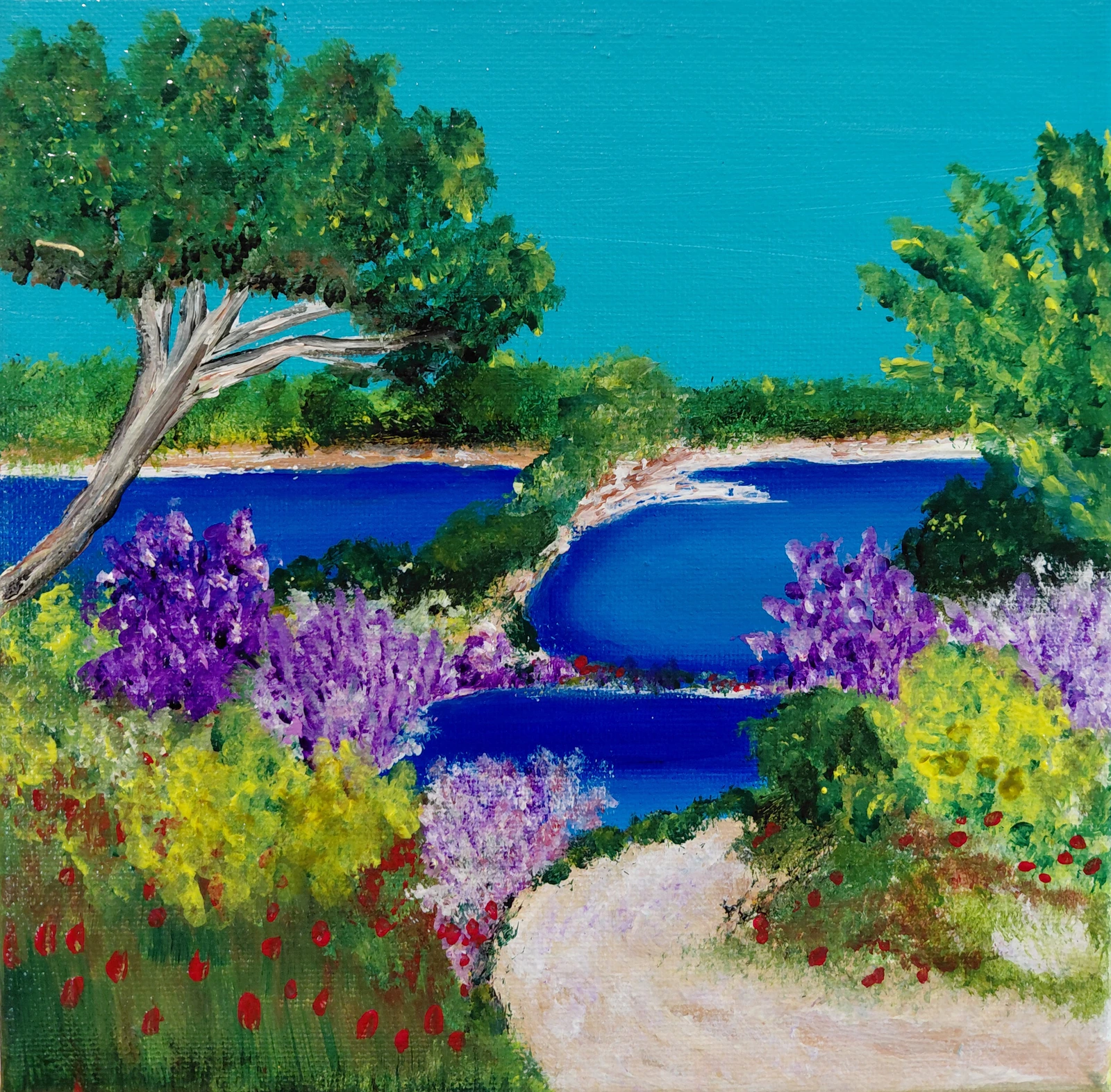Petite crique à Xalcidique, acrylique sur toile, appartient à ma collection Méditerranéenne. Cette œuvre est un hommage aux paysages qui ont façonné mon âme, des rivages baignés de soleil de la Grèce, mon pays natal. La xalcidique, située non loin de Thessalonique où je suis née, est un lieu que je visite depuis mon enfance, chaque été. C’est mon refuge, l’endroit où je me recentre et me calme lorsque les choses deviennent difficiles, mon rayon de soleil face à la grisaille. Cette œuvre est inspirée de ma crique préférée, dans ce lieu magique.