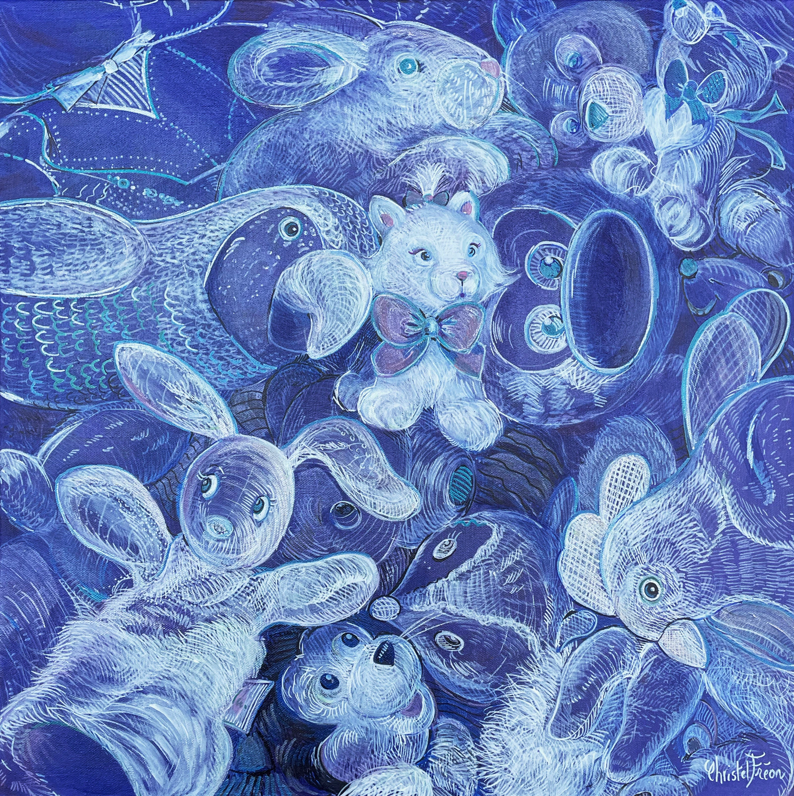 Cette ouvre représente un pèle-mêle de peluches dessinées au trait dans des camaïeus de blancs et bleus foncés. Le rendu est graphique et moderne par le jeu des traits, la diversité des formes et des animaux représentés emmène l’imagination dans un monde enchanté. Des légers effets phosphorescents apparaissent la nuit, soulignants les volumes sur l'ensemble de la toile.