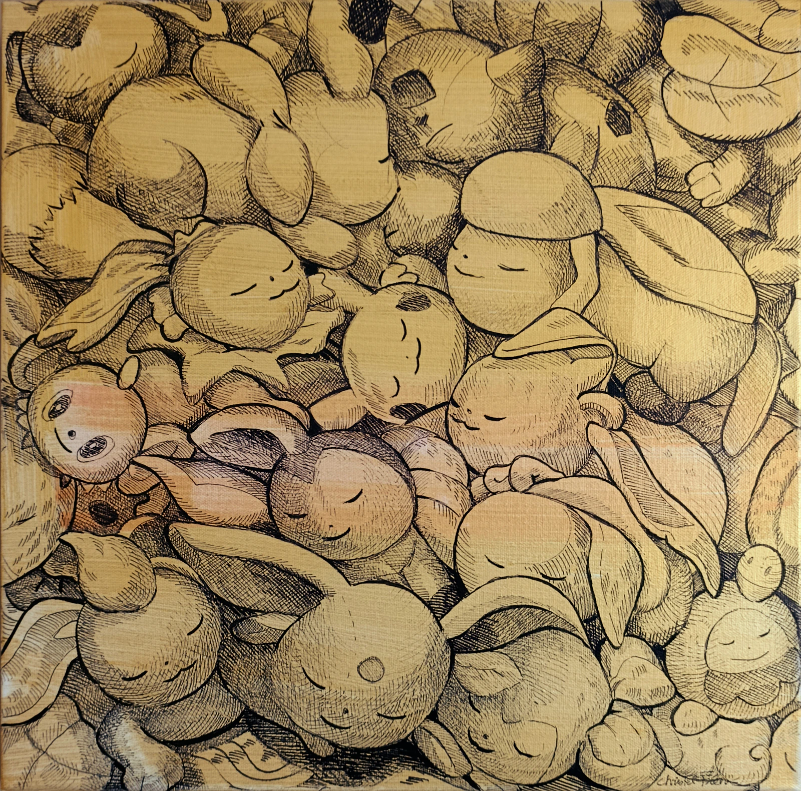 Dans cette œuvre, j'ai utilisé un marqueur noir pour dessiner avec délicatesse un bestiaire de créatures endormies. Chaque forme ronde et les lignes délicates expriment la sérénité et la tendresse. Seule une est éveillée! Un jeu de hachures donnent du relief aux formes sur un fond acrylique or aux effets graphiques. En effet on peut voir un mouvement dans la couleur or donnée par le pinceau. De plus tous les côtés sont peints dans la continuité du décor! Ce tableau apportera à votre intérieur une atmosphère chaleureuse, réconfortante, presque comme un doux rêve partagé.