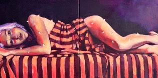 Portrait de la femme piquante, avec un jeu de lumière et de rayures. L’œuvre est un dyptique composé de deux tableaux à l’huile. Elle fait partie de la série « Vives »