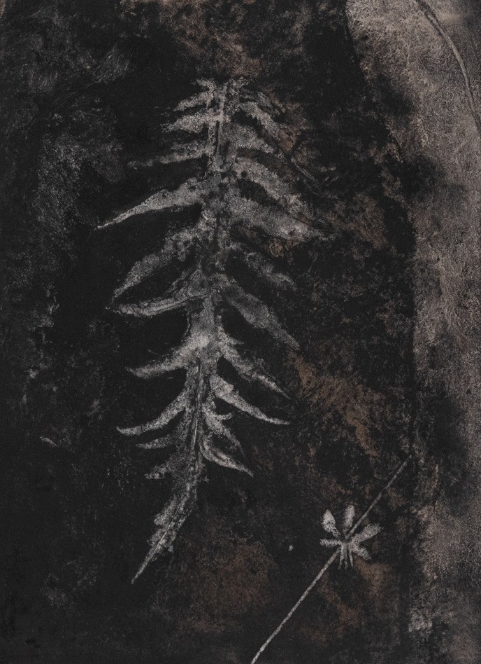 Dessin réalisé dans le cadre d'une résidence de dessin aux Ateliers des Arques. Réflexion sur le processus de fossilisation des végétaux avec la reproduction d'une feuille de plante. Technique de fusain liquide.