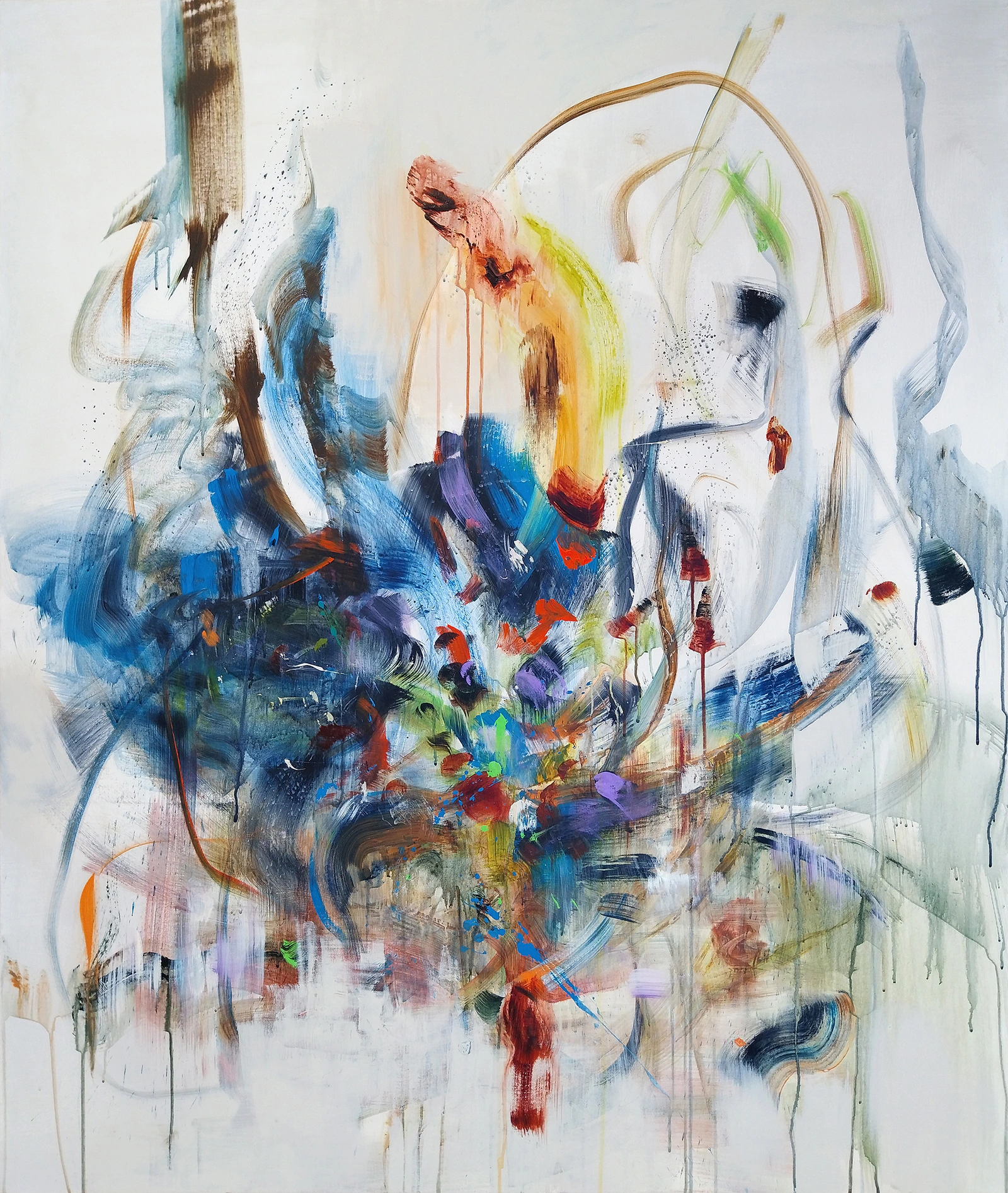 Cette composition abstraite d'aspect floral est comme une force naissant à la vie dans un jaillissement de couleurs émanant d'une même source. Les formes, se multipliant autour d'un axe central, sont le fruit d'autant de coups de pinceaux sans reprise qui expriment la vitalité de la nature. J'ai choisi de créer une ambiance emprunte d'un un esprit de fête en utilisant des couleurs vives pour tonifier ce qui apparaît comme une entité à part entière, telle une forme de vie végétale. La spontanéité des gestes pour appliquer la peinture m'a permis de poser les touches de couleurs comme autant de notes de musique qui restent abstraites par leur absence de forme.
