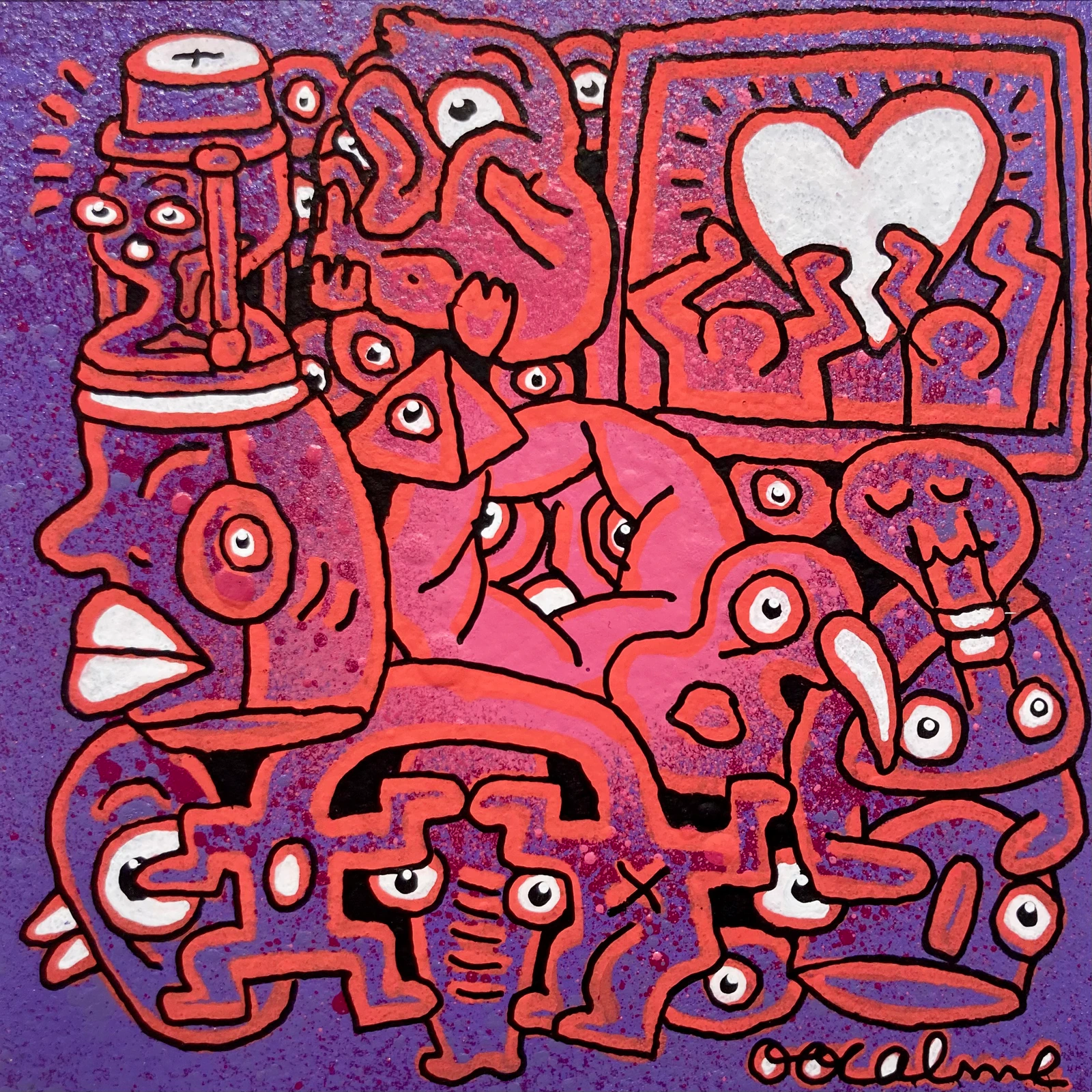 Oocalme crée un univers visuel où la multiplication des formes et des personnages donne naissance à un imaginaire foisonnant. Ses œuvres, accessibles et puissantes, questionnent subtilement les dynamiques sociales et les rapports de pouvoir à travers des figures familières et des couleurs vibrantes. Ludiques et enfantines, ses compositions échappent aux codes artistiques traditionnels, invitant à l’interprétation personnelle. Par une liberté totale dans l’expression, l’artiste offre une expérience visuelle vivante, entre réflexion et plaisir, où le réel et le rêve se croisent.