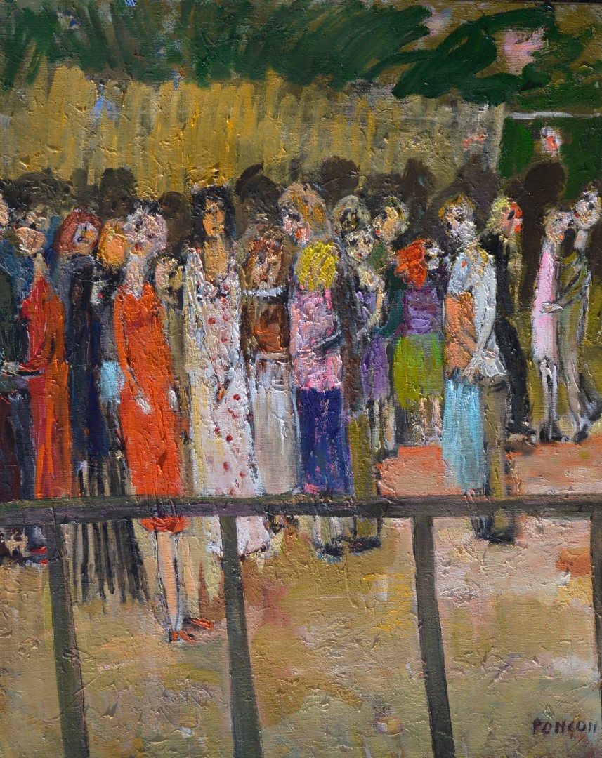 Alain Ponçon, avec ce tableau invite à l'imagination : un champ de courses la nuit, ou une élégante soirée en plein air… La barrière au premier plan, limite entre notre monde et le leur ?
