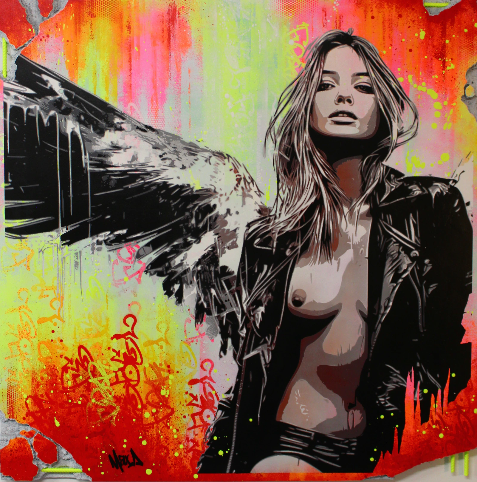 J’ai voulu capturer la force et la liberté à travers cette figure féminine ailée, mêlant réalisme et abstraction. La palette explosive et les touches de graffiti expriment rebellion et énergie brute. Cette œuvre incarne la dualité entre vulnérabilité et puissance, invitant à défier les normes. Elle apportera une vibration vive et audacieuse à votre espace, un appel vibrant à l’émancipation personnelle.