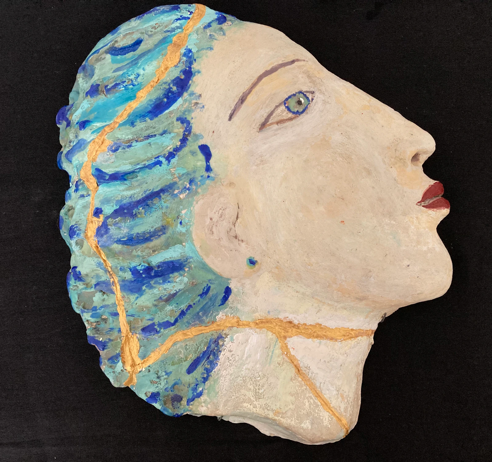 Cette sculpture en argile capture la force et la résilience humaine. J'ai voulu exprimer comment la beauté naît de la réparation, visible dans les éclats dorés qui traversent ce visage. Elle symbolise la renaissance après la fracture, apportant une énergie de courage et d’espoir vibrante à votre espace. Chaque détail incarne une histoire de transformation et d’acceptation, invitant à regarder au-delà des apparences.
