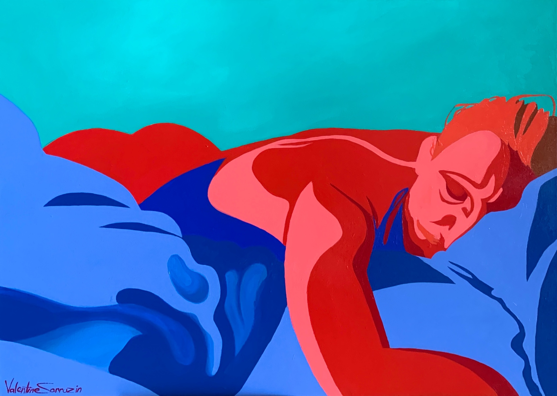 Née en 1999 en bordure de Paris, Valentine Sarrazin s’amourache très tôt des arts graphiques. Elle entame premièrement un cursus de bande dessinée qui l’amène à être publiée à la sortie de ses études avant de se concentrer pleinement sur la peinture. C’est à travers un univers coloré, chaud, aux lignes sensuelles qu’elle exprime ses mondes intérieurs.