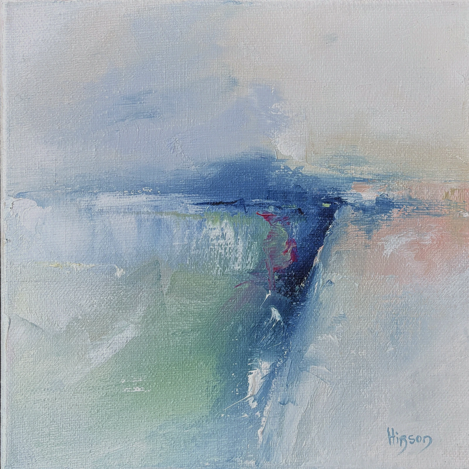 Cette œuvre abstraite présente une composition délicate et subtile, dominée par des teintes pastel de bleu, vert, et beige. Une ligne sombre et centrale s'étire à travers la toile, évoquant un horizon ou un chemin mystérieux. La texture douce et fluide des coups de pinceau suggère un mouvement léger, presque éthéré, créant une atmosphère de rêve et de contemplation. Les nuances de couleurs se fondent harmonieusement, offrant une profondeur visuelle qui capte immédiatement l'attention. Ce tableau, par sa palette apaisante et sa composition équilibrée, invite à la réflexion et à l'évasion mentale, transformant l'espace environnant en un lieu de sérénité et de mystère. Les transitions délicates entre les couleurs démontrent une maîtrise technique indéniable, rendant cette œuvre à la fois captivante et méditative.
