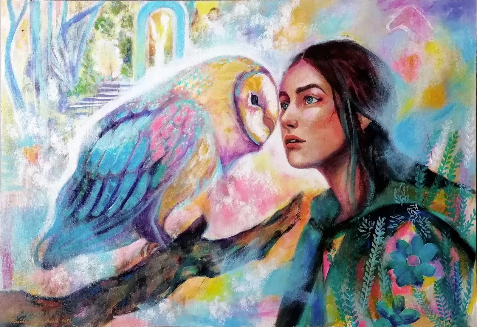 Cette peinture marque un tournant dans ma collection "Réalités Édéniques" puisque je me détache d'une forme de perfection dans le coup de pinceau pour chercher davantage de spontanéité, d'élan naturel. Il s'en suit que des couleurs éthérées et une porte vers le paradis est apparu comme un signe de bonne augure. La chouette est un animal, pour moi, fascinant. Longtemps, elle m'a effrayée mais j'ai depuis appris à la découvrir et elle m'apparaît désormais comme une source de Sagesse et d'Enseignement, accompagnant la jeunesse dans son évolution.
