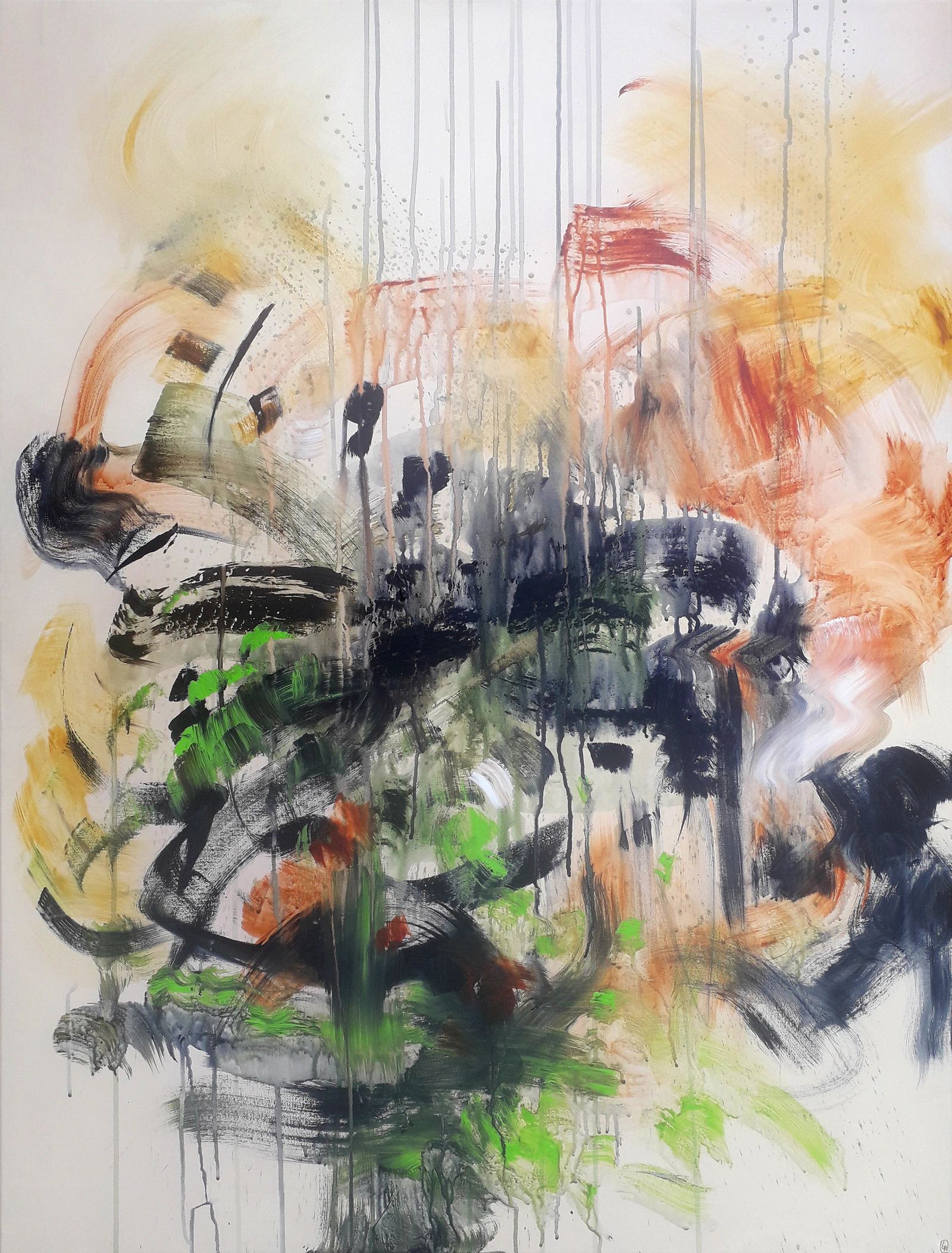 Dans cette représentation de la nature en pleine mutation, j'induis la perception dans un même temps des deux étapes opposées du cycle de la vie, en mêlant déconstruction et reconstruction d'une même forme. Les éléments colorés semblent animés d'une volonté propre en voulant franchir les limites de l'abstraction pour investir le monde du représenté. C'est comme si elles tentaient de prendre vie en des personnages végétaux tangibles mais non encore complètement définis. J'ai personnalisé cette œuvre par l'emploi de couleurs pures, vives pour la plus grande part, donnant à l'ensemble un aspect plus nerveux et plus électrique que dans les précédentes peintures de la série, ceci afin d'accentuer une certaine tension. L'émergence de deux entités posées dans le décor donnent un aspect plus stable à la dynamique des formes en les contenant chacune dans leur périmètre respectif.