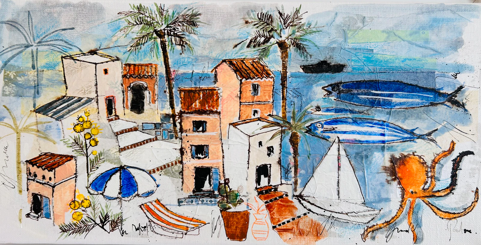 L’artiste peintre Cécile Colombo est née en 1969 à Marseille. Elle suit les cours d’Art Appliqués aux Beaux-Arts et enchaîne avec une formation de plasticienne d’Environnement Architectural et de Décoration Urbaine. Son atelier est situé dans le sud de la France à Gémenos. Cécile Colombo travaille depuis toujours en technique mixte. Elle prépare sa toile en papier marouflé, y colle des papiers colorés, des tissus, de l’encre et de la peinture délavée afin de donner une coloration générale à sa toile. Une fois le fond réinventé, elle y dessine à l’encre de chine, au brou de noix, à l’encre colorée ou à l’acrylique. Les couleurs aquarellées sont rehaussées de pastels gras ou secs. Toutes ces matières donnent à ses peintures une atmosphère de fantaisie et de légèreté. Très inspirée par la méditerranée, Cécile prend des photos de détails, de balcons, de fruits, de pierres et végétaux qu’elle mélange dans ses peintures pour retranscrire l’atmosphère d’un lieu. La suggestion, la matière, le détail qui semble anodin révèlent un univers pictural très inspiré qui nous offre des instants magiques. Cet univers, elle le décline également sur des objets plus usuels. Elle peint sur des coussins, des voiles de bateaux, des sacs. Elle s’est tout naturellement tournée vers un nouveau matériau : la céramique. Ses créations de plats, bols et sculptures représentant des poissons, fruits, baigneuses rencontrent un vif succès. Ses « Baigneuses » d’ailleurs, désormais iconiques, se déclinent sur des toiles de différents formats et supports.