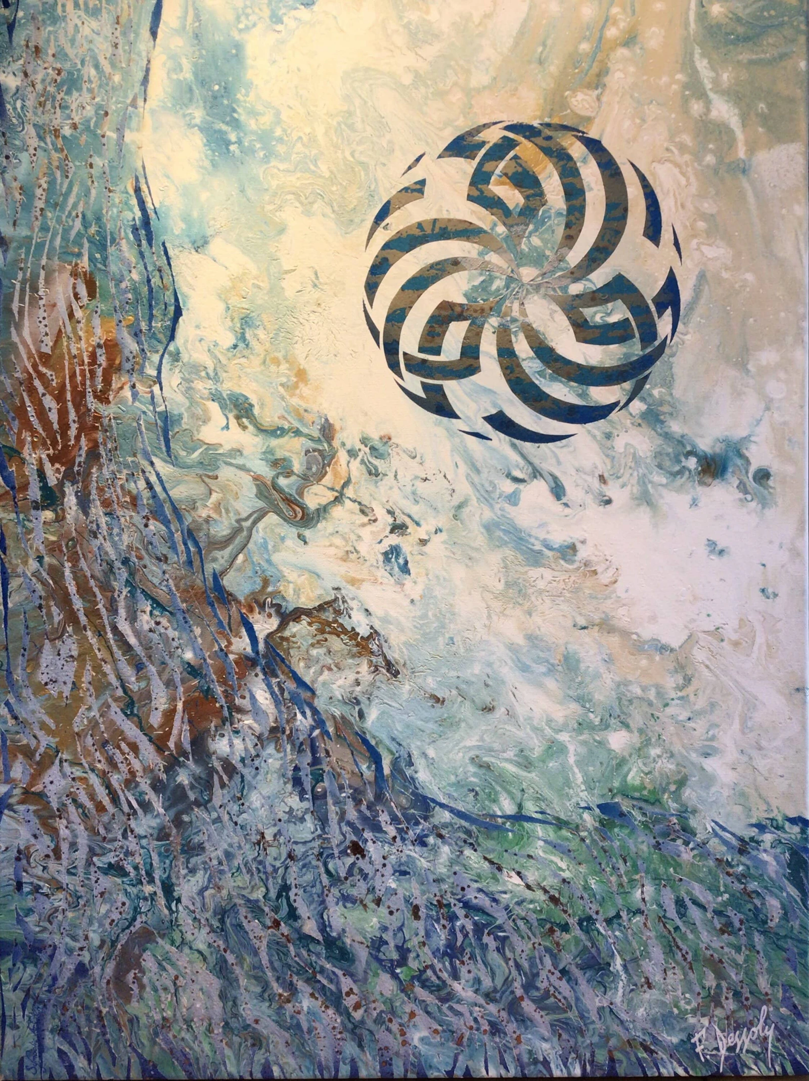 Equilibre entre chaos et harmonie, à travers un fond fluide et organique. L'ensemble évoque un apaisement intérieur, où le mouvement se transforme en calme.