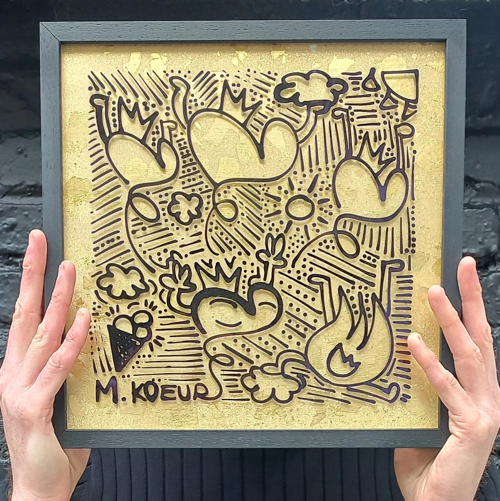 Oeuvre unique. Dessin original à l'encre brillante Krink sur verre musé anti UV anti-reflets et haute transparence. Dessin réalisé en contre parement du premier verre (au dos). L'oeuvre est rehaussée dans un cadre sur mesure sur un fond à la feuille de cuivre. Fond effet écailles.. Une collaboration pensée avec mon encadreur préféré : “Autour d’un cadre” Une oeuvre d’inspiration, chacun apportant son savoir-faire afin de créer une oeuvre nouvelle sur deux couches de verre. Nous avons sélectionné ensemble les plus belles matières, chaque cadre est créé sur mesure et assemblé à la main.