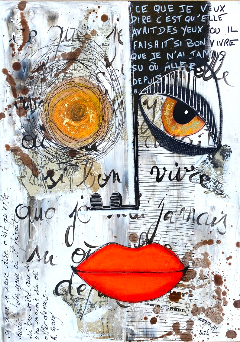 Cette œuvre est une exploration de la mémoire amoureuse et de la trace indélébile laissée par l'autre. Dans ce format vertical , l'artiste fusionne la figuration expressionniste, le collage et la poésie pour offrir un portrait qui n'est plus seulement une image, mais un sentiment. "Ce que je veux dire, c'est qu'elle avait des yeux où il faisait si bon vivre que je n'ai jamais su où aller depuis." R. Gary L'écriture manuscrite, tantôt nerveuse et scripturale, tantôt calligraphiée avec élégance, donne à la toile un rythme musical et une urgence émotionnelle. Roger M. ne se contente pas de peindre un portrait ; il peint l'impact d'une présence. C'est une œuvre sur l'errance émotionnelle et la beauté refuge. Pour un collectionneur, Ses yeux à elle représente une pièce de caractère, à la fois intellectuelle par ses références littéraires et viscérale par sa facture plastique.