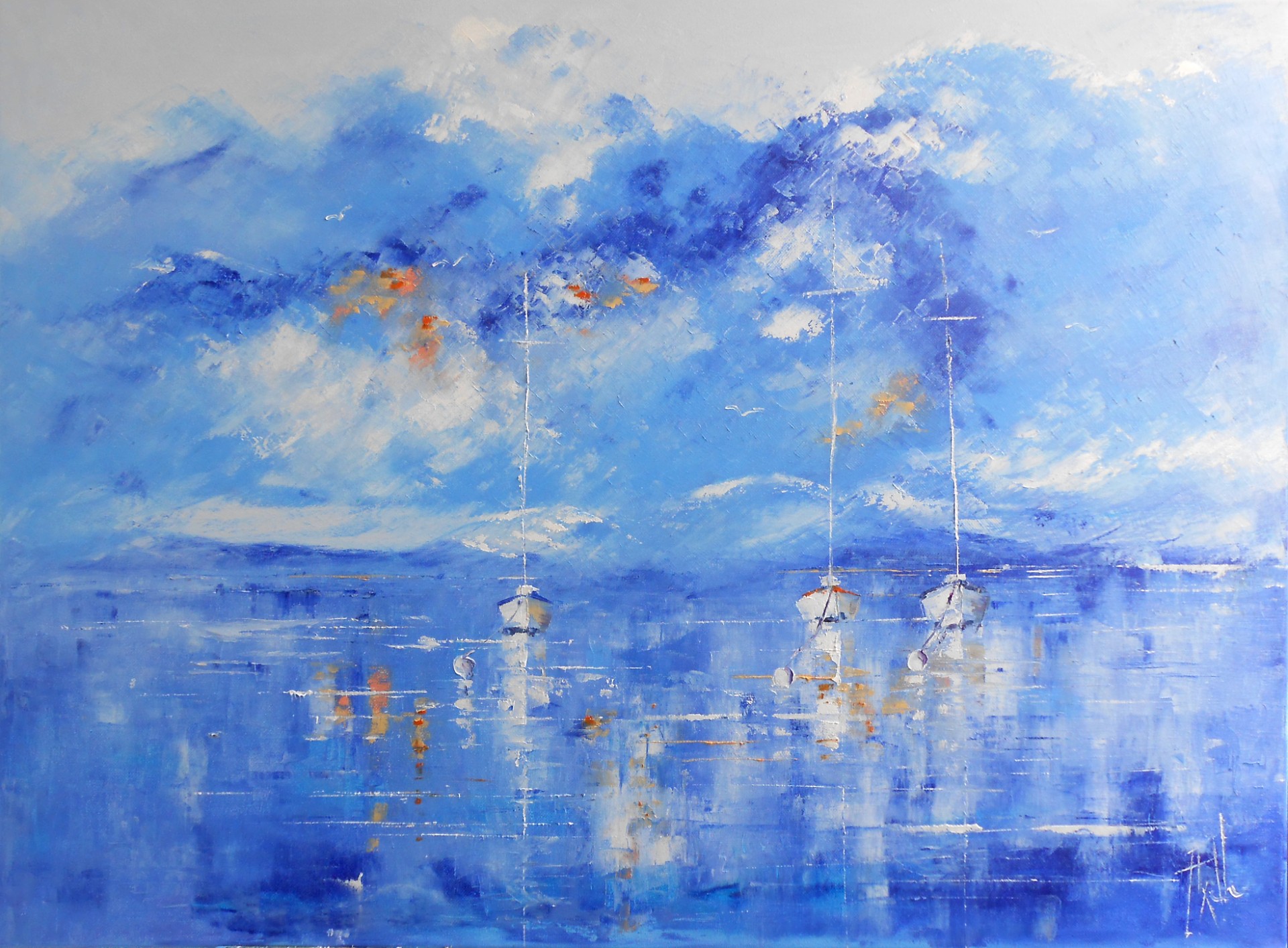 "Silence sur le Lac Léman" est un tableau représentant des voiliers attachés à leur bouée, en attente de repartir vers d'autres flots ... Le ciel changeant présage la venue probable d'un orage, peut-être avant le coucher du soleil ou la quiétude profonde d’un lac au petit matin, enveloppé dans des teintes bleutées apaisantes. On aperçoit les montagnes des Alpes qui se mêlent aux nuages ... La douceur et la fluidité de l’huile permettent de faire vibrer cette atmosphère paisible, presque suspendue dans le temps. Ce tableau apportera à votre intérieur une sensation de calme, d’évasion et d’harmonie, un véritable souffle de sérénité