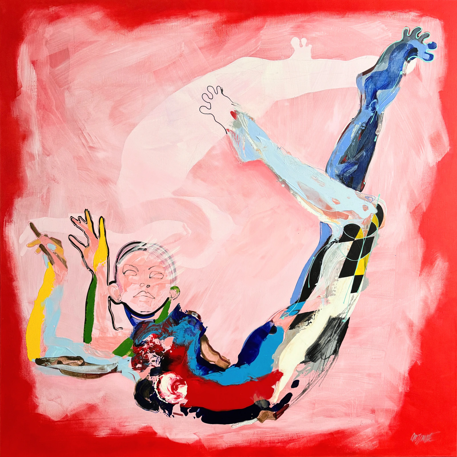 Dans Six mains, six pieds , la toile explore l’équilibre vivant entre gravitation et liberté. Les corps démultipliés et suspendus oscillent entre maîtrise et abandon, densité et légèreté. La couleur devient souffle et mouvement, traduisant la force vitale et l’instinct créateur. La peinture ouvre un univers où le spectateur est invité à percevoir le dynamisme du corps, à ressentir l’énergie du vivant et à s’immerger dans une expérience physique et émotionnelle.