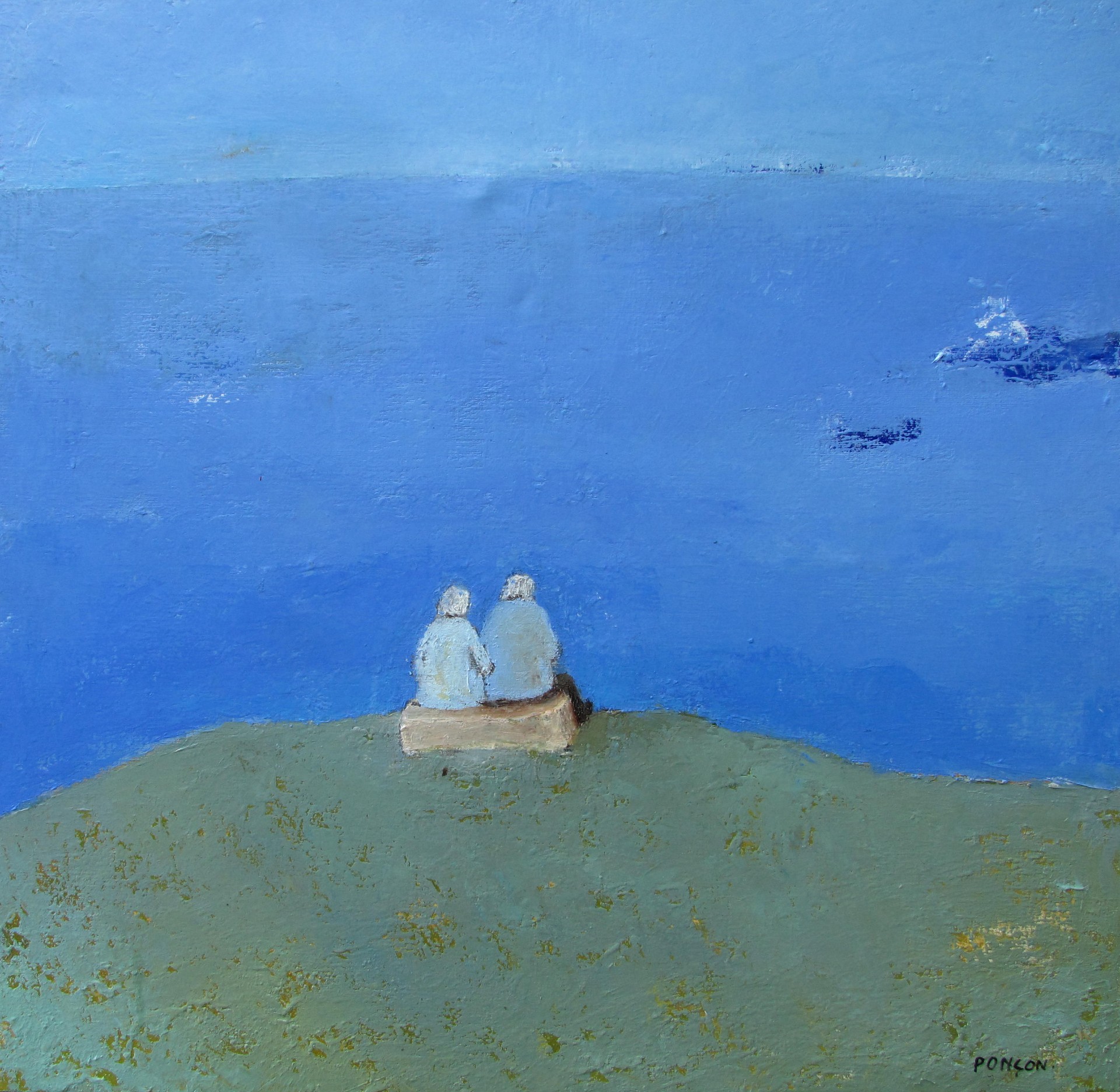 Deux personnes âgées assises face à l'immensité bleue, partagent un moment de calme et de complicité. Le paysage épuré invite à la méditation et à la sérénité. Une œuvre pleine de douceur et de silence, signée Ponçon !