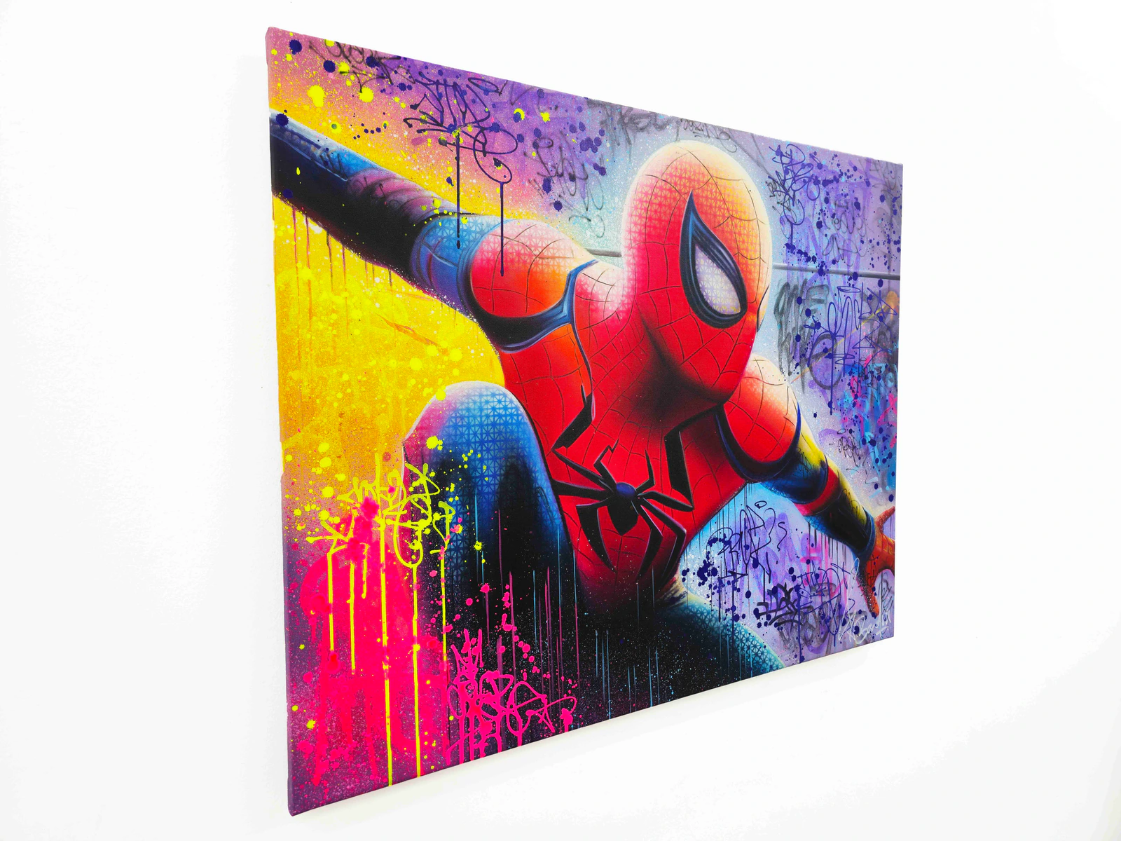 Nom Du Tableau : Spider-man City Collection : marvel Artiste : Vincent Bardou Dimensions : 100 x 81 x 3 cm Technique : Peinture à l'huile, Bombe de peinture, Aérographe Année : 2025 Œuvre Unique : Oui – 1/1 Format : Rectangle Support : Toile en Lin montée sur châssis en bois 3cm Encadrement : Non Finition : Vernis acrylique (2 couches) pour une protection optimale Signature : Signé en bas à droite et contresigné au dos Authenticité : Livré avec certificat signé par l'artiste peintre Vincent Bardou