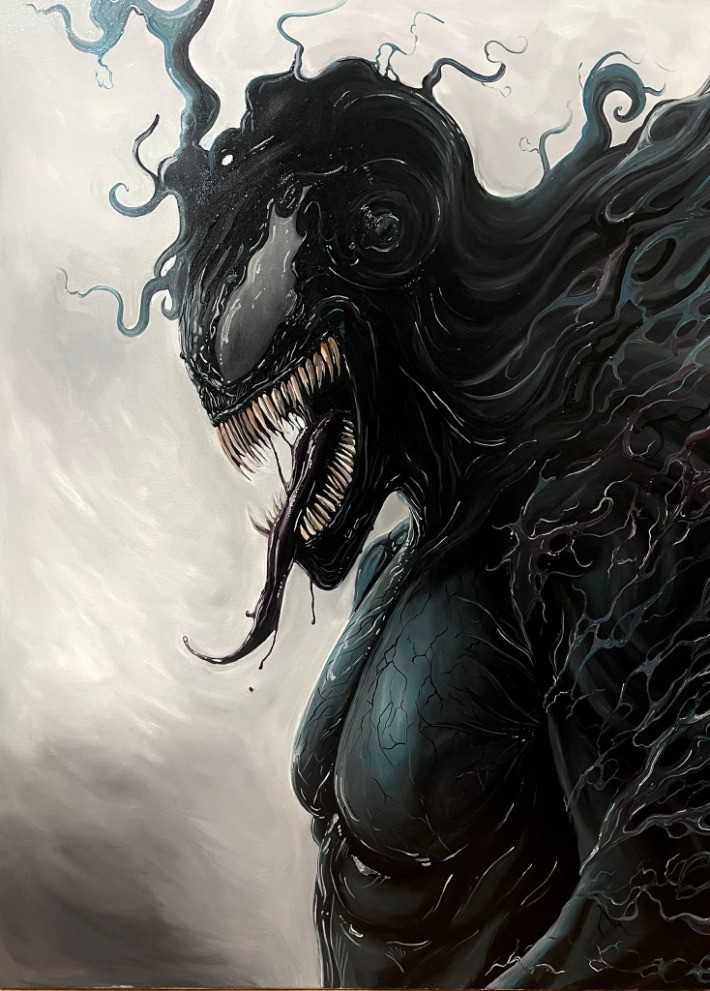 Une peinture à l’huile représentant Venom, baigné dans des ombres épaisses et des reflets glacés, révèle toute la puissance de ce symbiote parasite. Sa peau noire, luisante comme un liquide empoisonné, semble onduler de vie propre. La lumière accroche ses dents acérées et sa langue serpentine, donnant l’impression que le poison qu’il incarne pourrait jaillir hors de la toile.