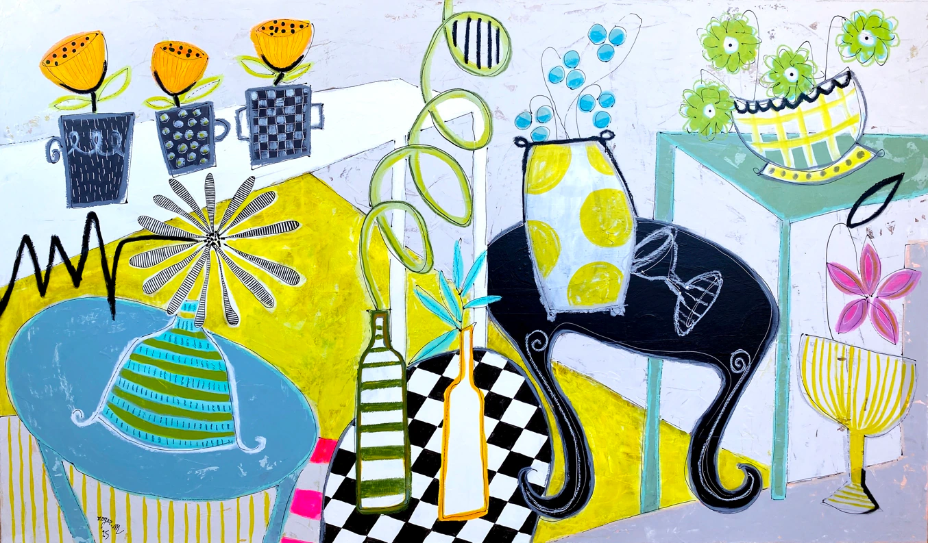« Symphonie Acidulée » porte bien son nom : c'est une œuvre qui ne se regarde pas seulement, elle s'écoute avec les yeux, vibrant d'un rythme jazz et d'une énergie résolument contemporaine. L’artiste déconstruit ici la nature morte traditionnelle pour lui insuffler un dynamisme narratif. Les perspectives sont volontairement bousculées, créant une profondeur rythmée où chaque objet devient un personnage à part entière. On retrouve la signature de roger.M dans ces lignes noires audacieuses et ces spirales organiques qui grimpent vers le haut du tableau, apportant une verticalité aérienne à l'ensemble. "Un désordre savamment orchestré où la rigueur du motif géométrique rencontre la poésie de la courbe." Par son format panoramique, cette pièce est conçue pour habiter l'espace. Elle transforme un intérieur en une galerie de lumière, agissant comme une fenêtre ouverte sur un imaginaire où la grisaille n'a pas sa place.