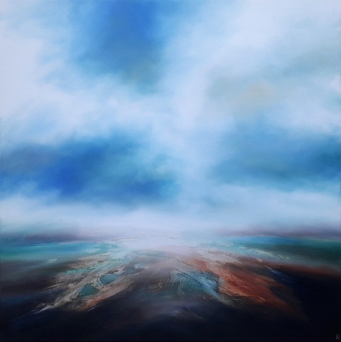 A l’aide de beaucoup de gel de structure, j’ai pu traiter les traces visibles à la surface de la terre comme autant de vestiges d'une vie organique. Elle présente des nervures qui témoignent de réseaux anciens et la diversité des couleurs utilisées tranche avec le bleu unique d'un ciel formaté apparaissant tel un signe symbolique. Je crois à la puissance des symboles et à leur action sur notre inconscient, j'imagine volontiers que certains d'entre eux seraient vivants dans un autre espace-temps et qu’ ils se manifesteraient parfois dans notre monde par le biais des éléments naturels, ils serviraient de guides pour qui sauraient les reconnaître. L'huile s'est imposée naturellement comme le meilleur moyen d'apporter de la transparence à la structure et du réalisme dans l'espace nuageux.