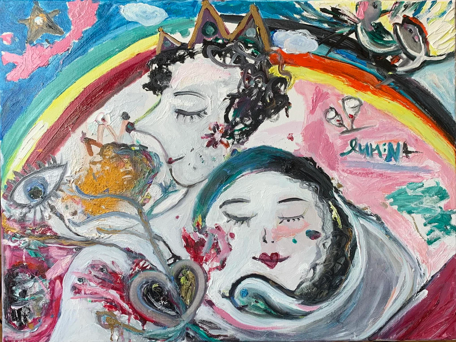 « Puisant son inspiration dans son subconscient, l’artiste raconte des histoires, des mythes, dans une esthétique naïve et enfantine contrastant avec la complexité des sujets traités. Envisageant la peinture comme une démarche psychanalytique, elle oscille entre figuration et abstraction et nous délivre une oeuvre très personnelle, à mi-chemin entre expressionnisme et symbolisme. » Lumina Wang, artiste-plasticienne et comédienne d’origine taïwanaise. Passionnée par les arts dramatiques et la mythologie, son univers singulier est retracé par des signes symboliques et une intrigue d’art dramatique. Il existe notamment une ambiguïté ludique dans ses peintures : un langage naïf voulu pour traiter des sujets complexes et psychologiques, comme les secrets familiaux, la nostalgie ou les traumatismes d’enfance, la féminité cachée ou assumée, l’interaction relationnelle, la passion et toutes les formes d’amour et de sexualité. Riche en métaphores et en sensualité, chaque peinture de Lumina Wang représente une histoire ou un mythe nouvellement créé. De manière libérée et intuitive, elle peint en suivant son inconscient et son animalité, même si, à partir d’un certain moment, elle arrive à y analyser ses choix esthétiques, comme la nature des couleurs utilisées ou les personnages représentés, jusqu’à relier tous ces éléments immergés et enfin décrire une histoire concrète.